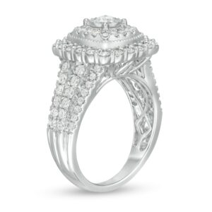 Give her a beautiful symbol of your love with this remarkable diamond engagement ring. Fashioned in cool 10K white gold, this spectacular design features a 1/5 ct. diamond – artfully set to enhance size and sparkle – wrapped in a double cushion-shaped frame of diamonds and intricate milgrain detailing. The split shank shimmers with four rows of diamonds to complete the style. Captivating with 1-1/2 cts. t.w. of diamonds and a brilliant buffed luster, this engagement ring is worthy of her affection.