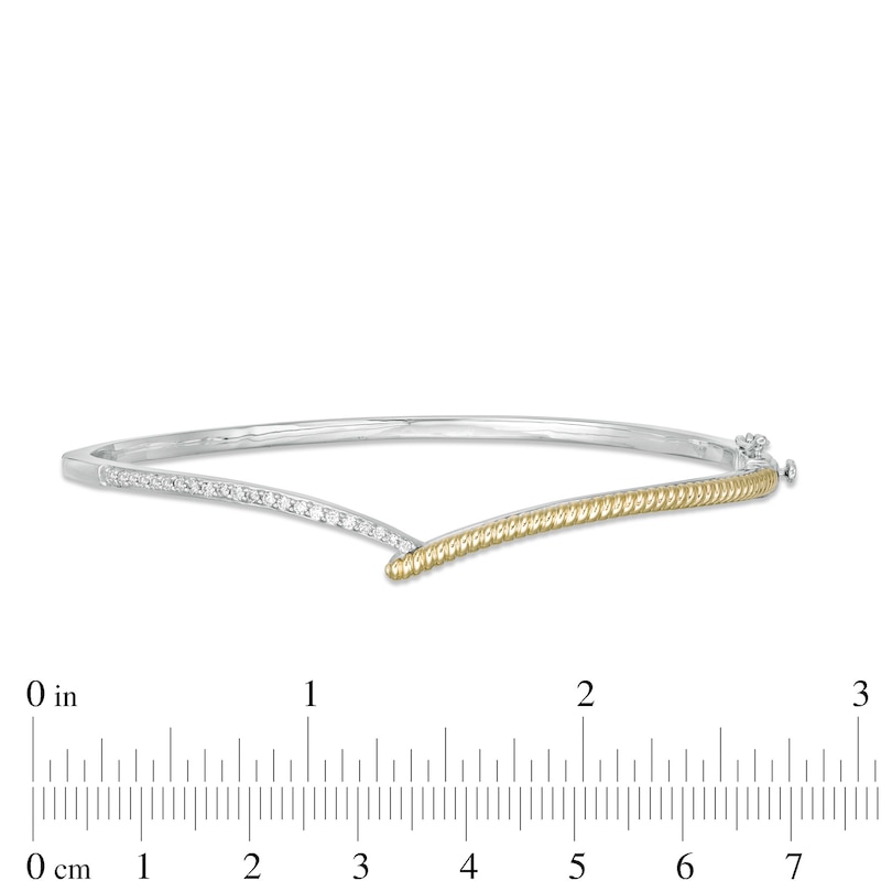 Truly exquisite, this diamond bangle bracelet sets a sophisticated tone. Crafted in sterling silver and warm 10K gold, this tailored chevron-shaped look features a gold rope-textured ribbon – symbolizing and a curved silver row of diamonds. Captivating with 1/4 ct. t.w. of diamonds and a bright polished shine, this hinged bracelet measures 7.0 inches in circumference and secures with a tongue and groove clasp.Embodying strength and grace.This exclusive fine jewelry collection inspires you to wear your strength, confidence and power.