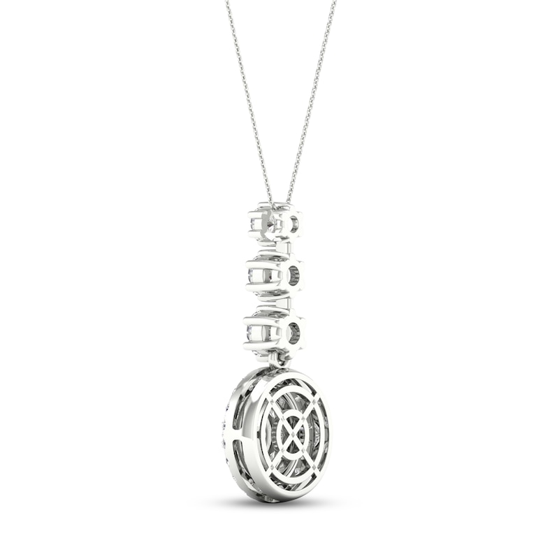 This dazzling necklace showcases a vertical row of three graduating round diamonds suspended over a circular pendant adorned in marquise and round-cut diamonds. Fashioned in 14K white gold, the diamonds total 2 carats in weight. The pendant sways from an 18-inch cable chain that secures with a lobster clasp.